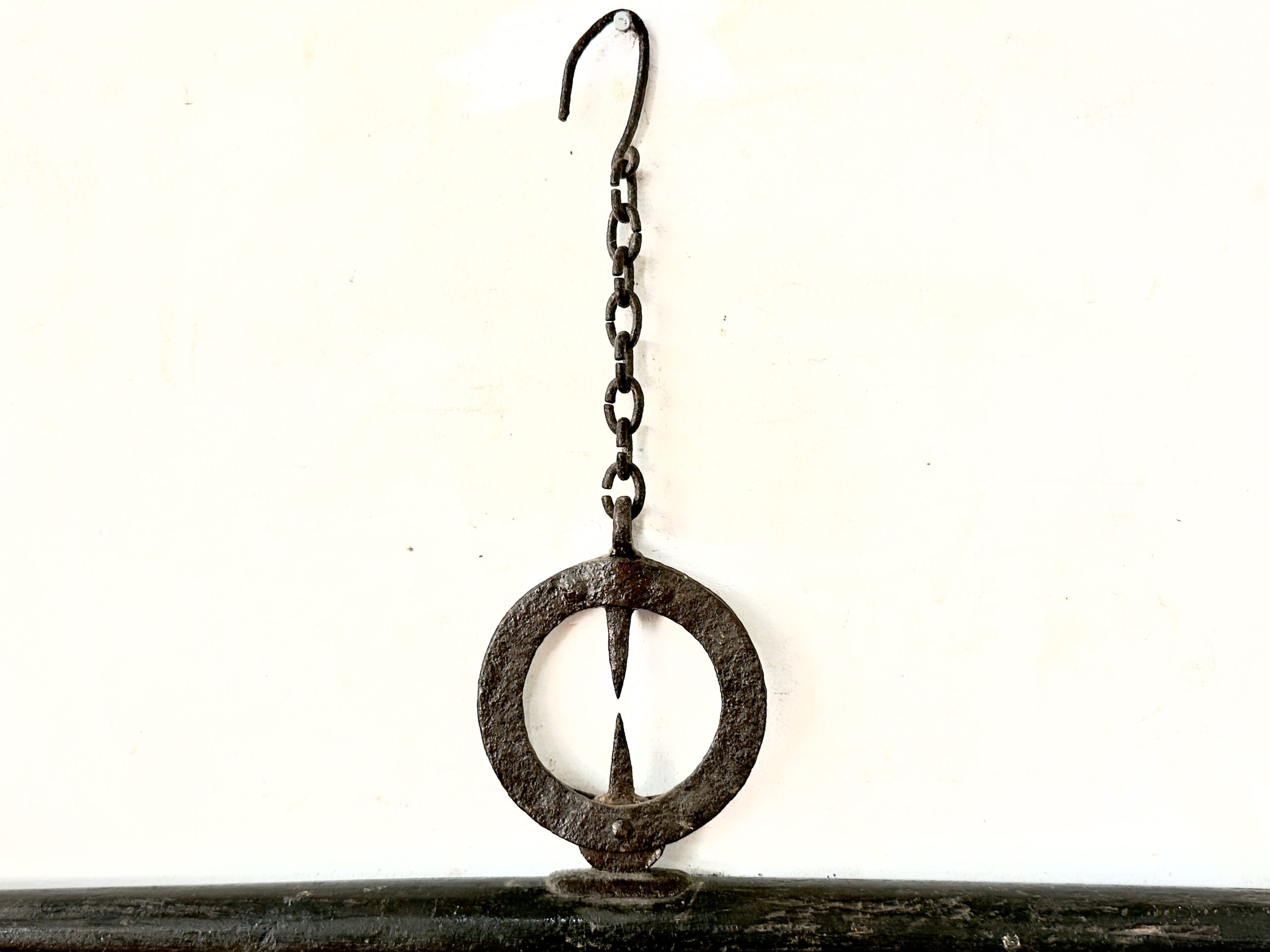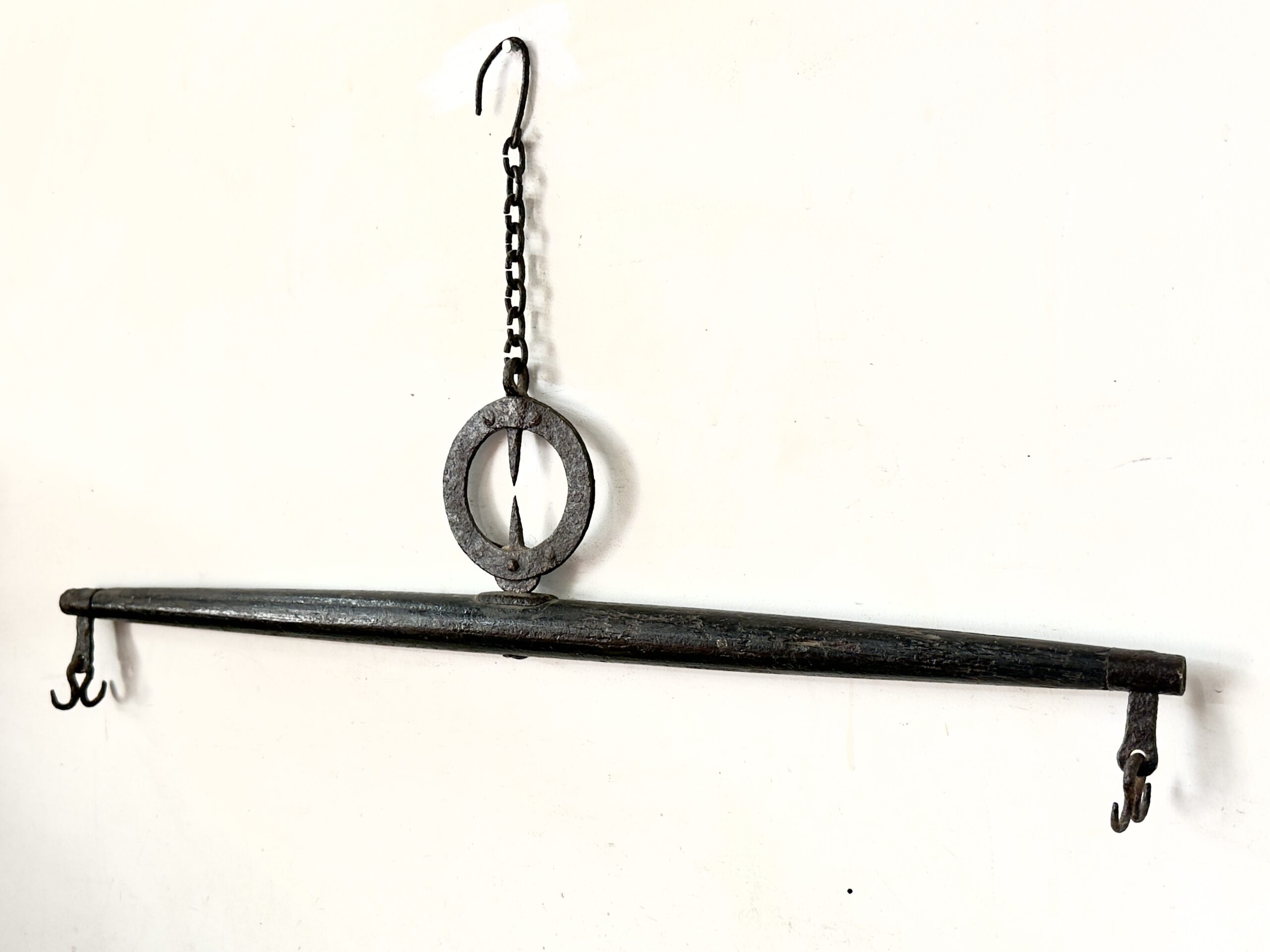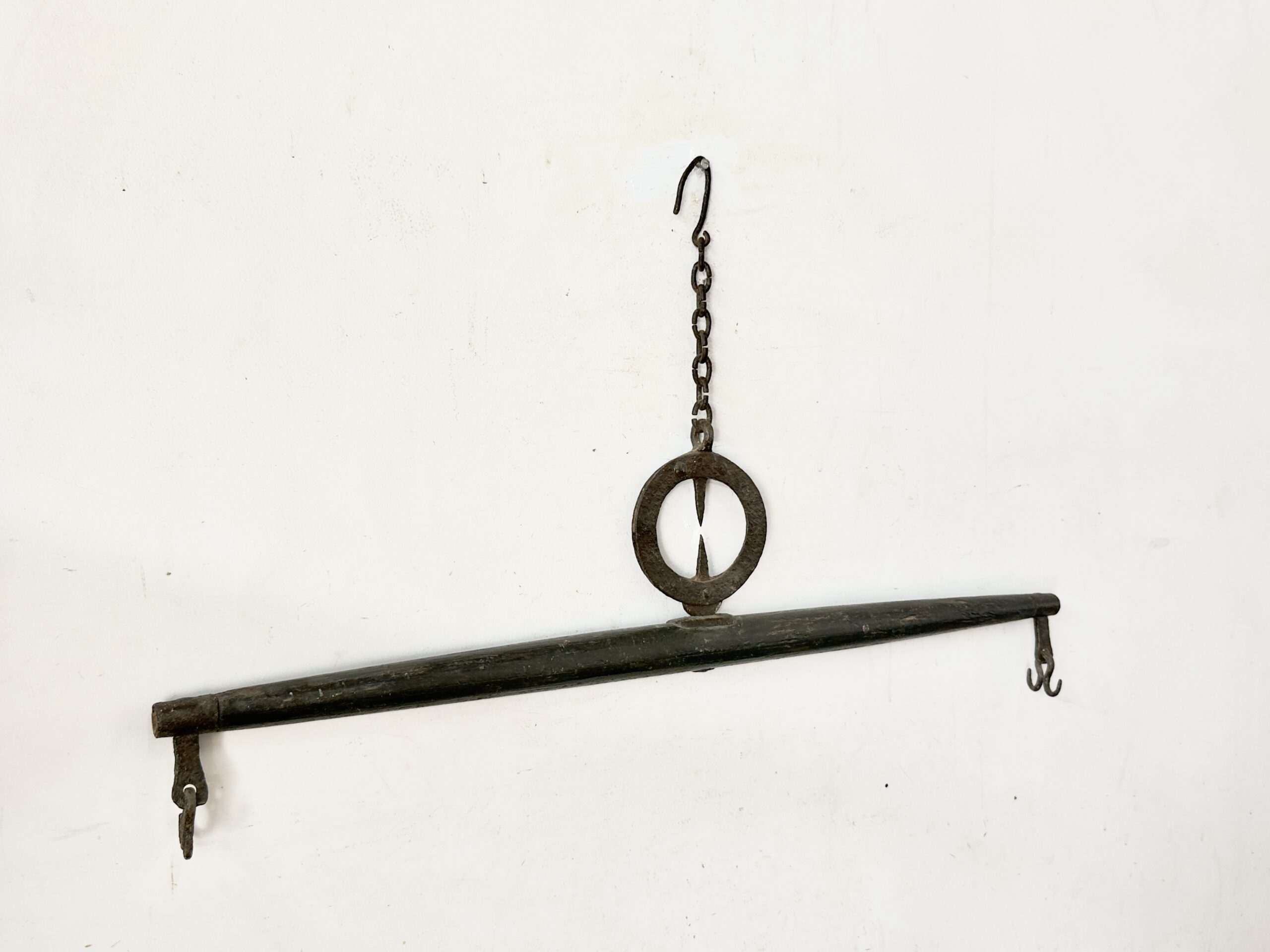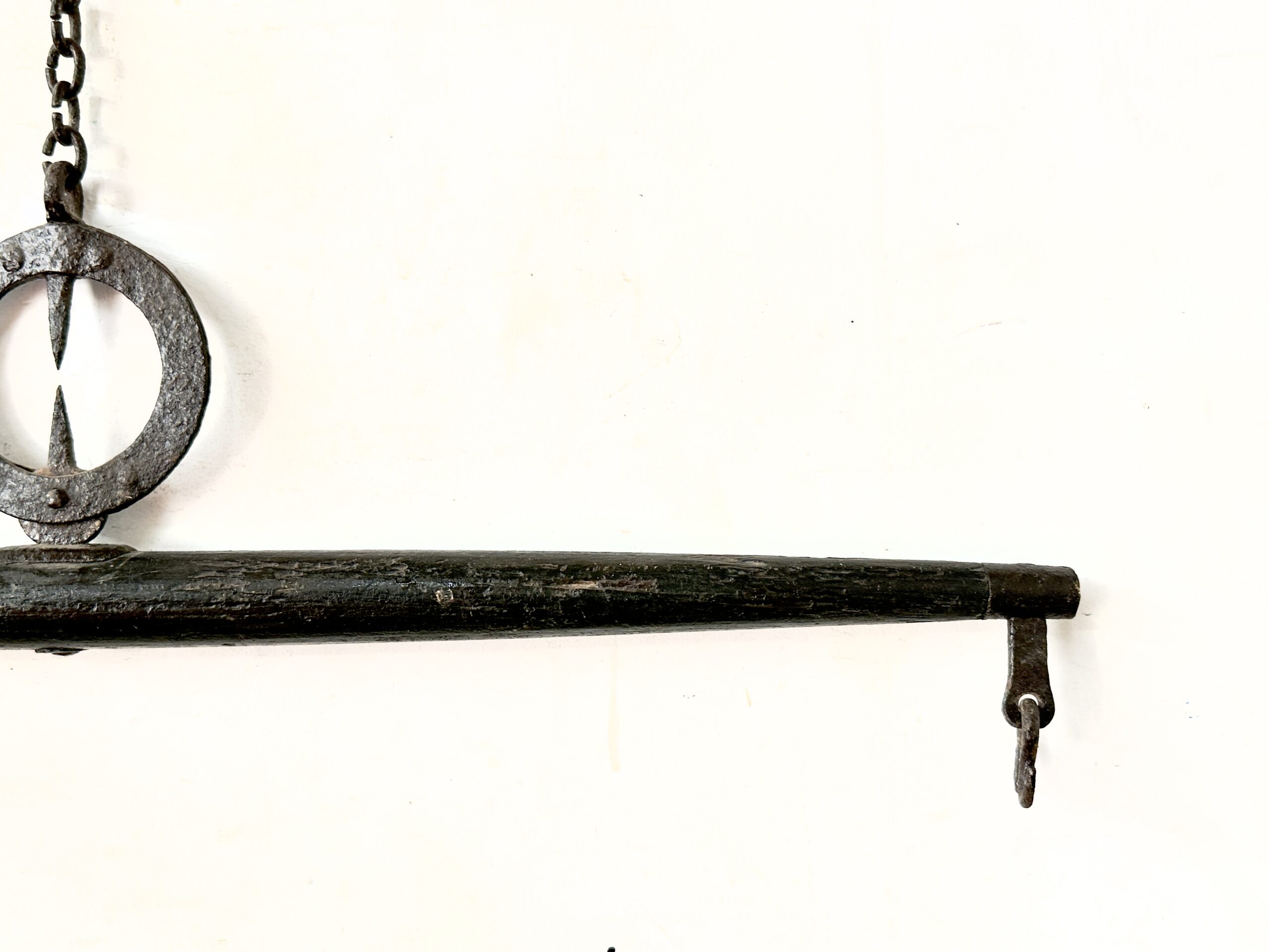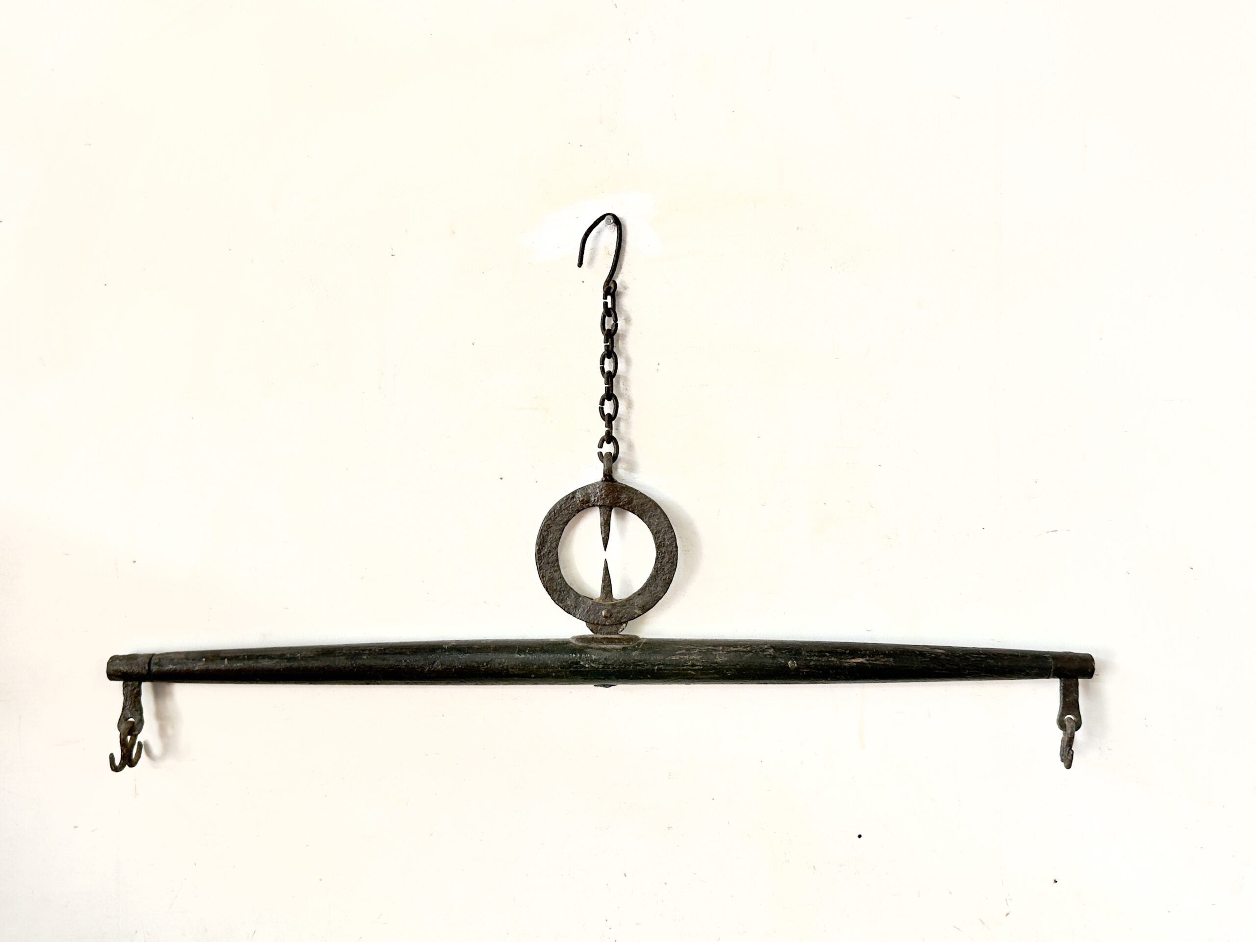 Antique 95+ years old Wood body with Cast iron fittings heavy physical balance used in spice trade era to weigh spices in Kerala, ver rare hook hanger type where the product to be weighed will be put in gunny sacks and hung in hooks at one end while the weighing stones will be hung in the opposite side there by they added or removed the contents till the balance evened out at the center pointer, very rare collection and decor piece